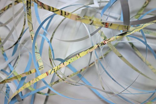 Alice Musiol hat anläßlich des Krippenweges für das stattreisen Schaufenster eine Installation aus verflochtenen Streifen zerschnittener Landkarten angefertigt. Sie nimmt damit Bezug auf die Vielzahl der zurückzulegenden bzw. zurückgelegten Wege, welche die Weihnachtszeit kennzeichnen – sei es die lange und mühevolle Reise der Heiligen Familie von Nazareth nach Bethlehem, für die Joseph unter drei verschiedenen Wegen wählen musste; die Reise der Hirten, die eilends herbeikamen, wie die Bibel berichtet oder die der Heiligen Drei Könige, die aus allen Teilen der Welt mit Elefanten, Kamelen und anderen exotischen Tieren nebst Dienern, Verpflegung und Geschenken daherkamen, um dem Jesuskind zu huldigen. Die Kunde von Jesu Geburt wurde in alle Welt getragen und mobilisierte Menschen von überall. Es ist dieses Motiv der Reise, das die Künstlerin in ihrer Darstellung der Krippe herausstellt und zentriert. Damit ist gleichzeitig auch eine inhaltliche Beziehung zum Ausstellungsort hergestellt, dem Verein stattreisen köln e.V., der seit vielen Jahren Wege abseits der üblichen Touristenpfade geht, um die Stadt Köln zu zeigen.