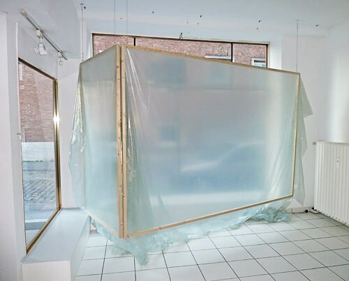 Der Kölner Künstler Matthias Surges zeigt eine Installation seines Atelierfensters (ca. 2,5 x 2 m). Er transferiert damit das Scharnier zwischen dem Innen- und Außenraum, das den Blick in beide Richtungen zuläßt, aus einem persönlichen Produktionskontext in den öffentlichen urbanen Raum. Statt jedoch damit einen Einblick in seinen Arbeitsraum und die dort stattfindenden Prozesse zu geben, wird durch das opake Material vielmehr eine Nicht-Einsehbarkeit des Raumes betont und die Betrachtung an sich thematisiert.